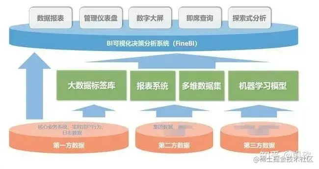 数据分析层:这里就要用到BI分析系统,比如FineBI,如果是传统的数据挖掘还有SPSS,这一层主要是对数据进行加工,然后进行深层次的分析和挖掘。