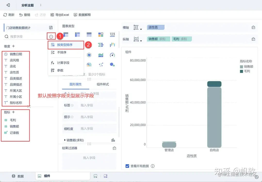 得到了清洗后的数据,业务就可以进行自助式分析了。FineBI 的可视化探索分析,是面向分析用户,让他们能够以最直观快速的方式,了解自己的数据,发现数据问题的模块。业务人员只需要进行简单的拖拽操作,选择自己需要分析的字段,几秒内就可以看到自己的数据。