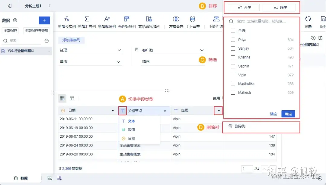 IT人员创建了数据连接和业务包以后,为业务人员构建BI基础的数据模型,分析用户配置好关联关系,分配好权限和设置好数据更新的频率,提供一层可供业务理解的基础模型。然后业务再在数据集中对这些数据进行进一步的加工处理,比如筛选数据、过滤数据、数据分组汇总、数据行列转行等等,经过加工后的数据就是业务进行分析的最终数据了。