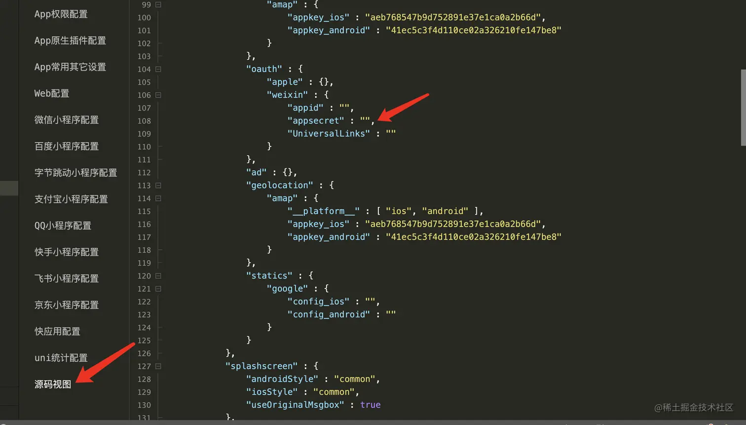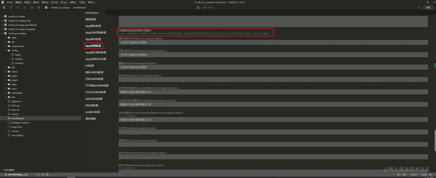 4.点击《App权限配置》,android会自动添加权限,IOS需要配置如下权限