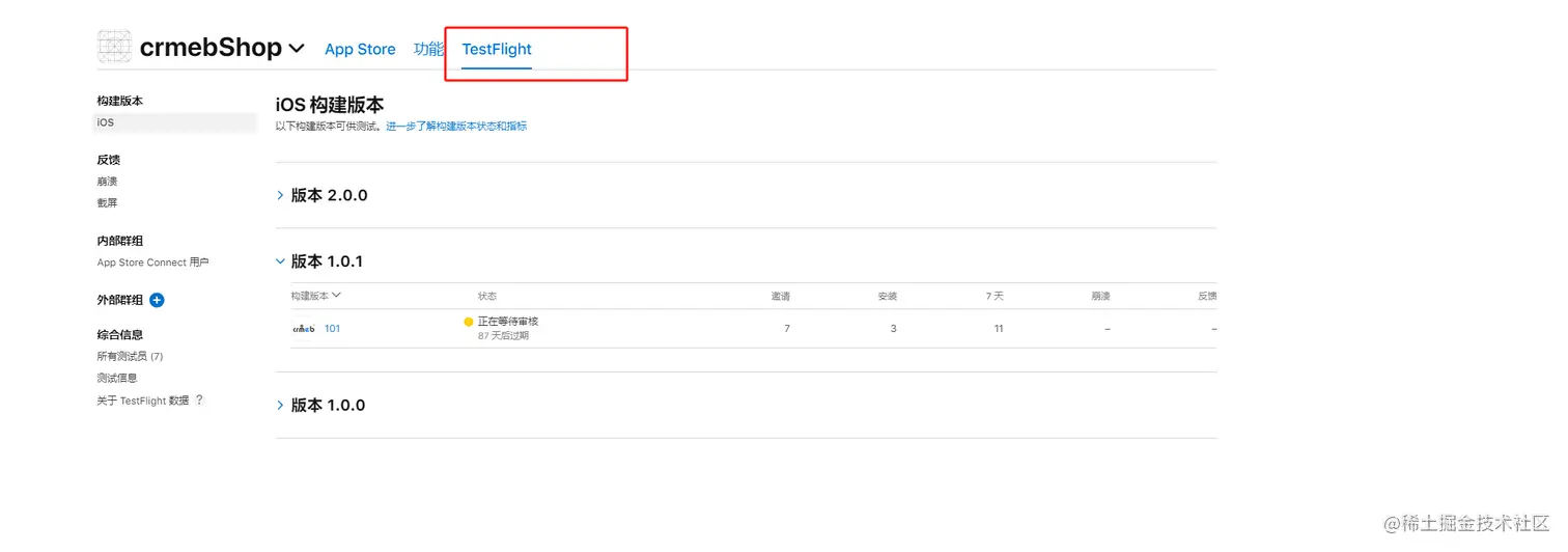 在TestFlight这个里面可以看到上传的版本,点击进去后可以添加测试人员还有一些别的操作