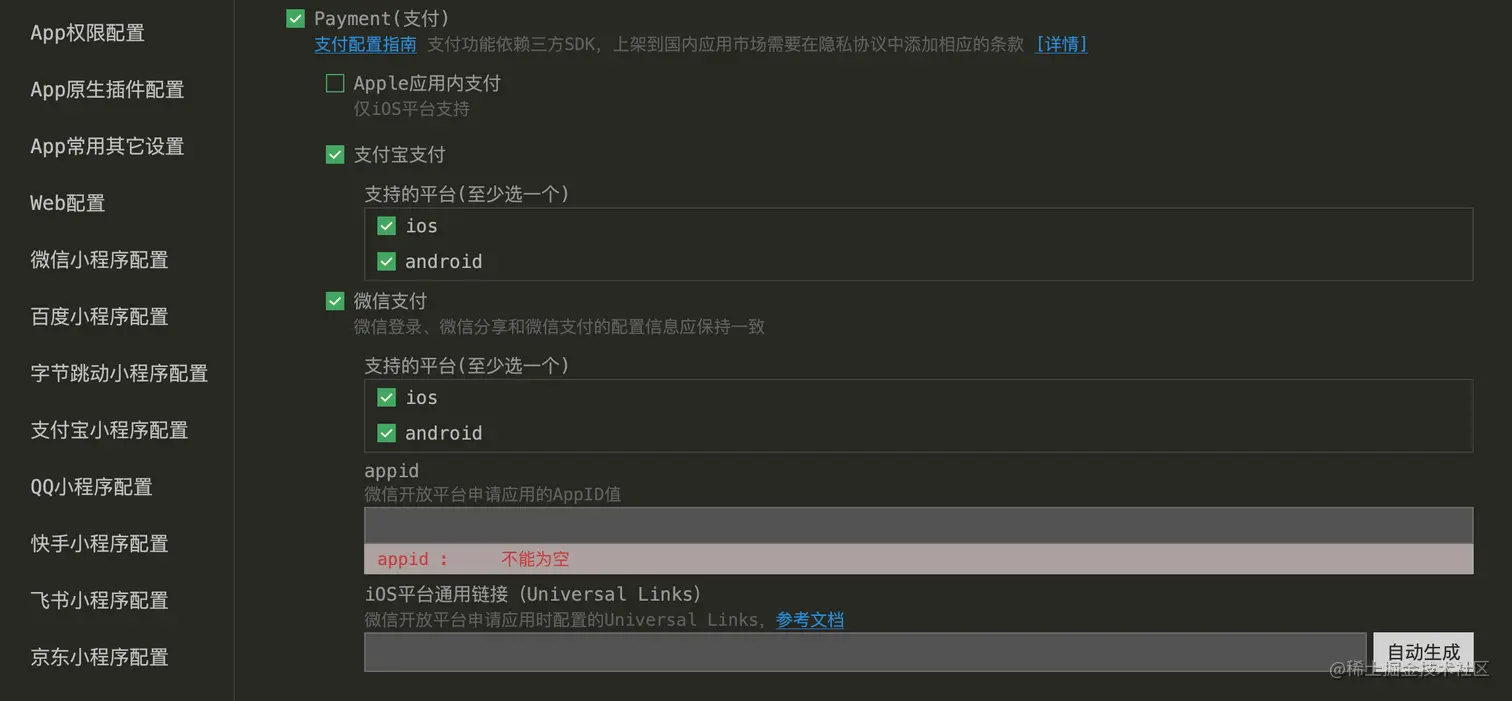 微信所有的相关配置需要appid和需要生成ios平台通用链接