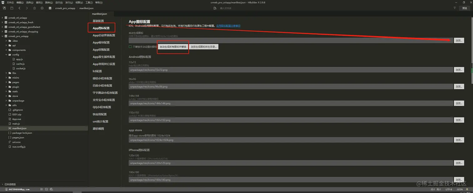 2.点击《App图标配置》,上传APP的图标文件,图标必须是1024*1024大小,png格式,直角边,非透明,点击《自动生成所有图标并替换》