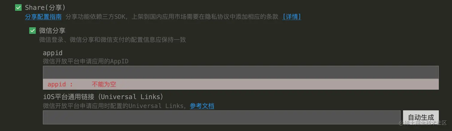 3-3 勾选《Share(分享)》,选择微信分享,填写开放平台的 appid 和 Universal Links
