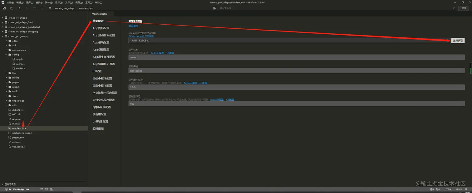1.打开 uni-app 根目录下的 manifest.json 文件, 点击《基础配置》,重新获取 uni-app应用标识,获取之后填写 应用名称,应用描述,应用版本名称,应用版本号