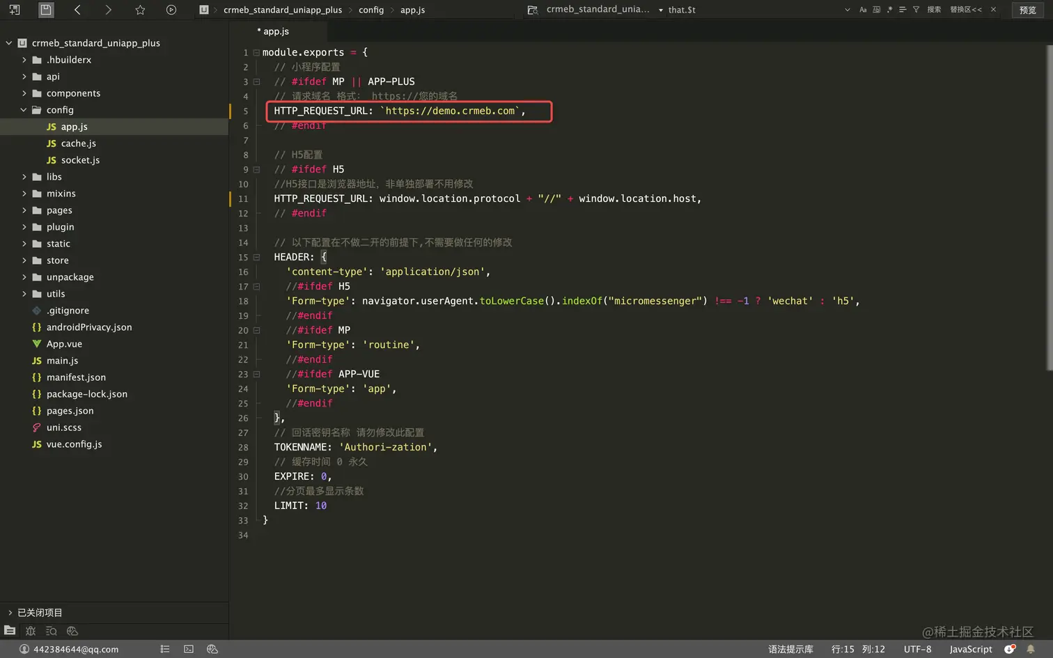 1.打开uni-app下config/app.js修改接口地址,将下图红框中的地址修改成您的域名