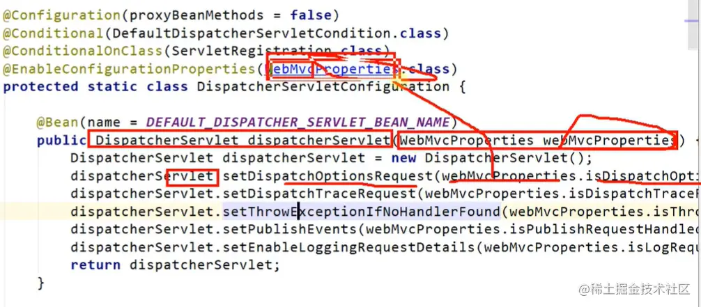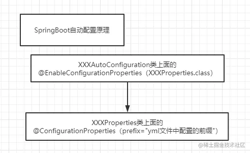 xxxxxAutoConfiguration(这一个类的上面会有一个 EnableConfigurationProperties(类名),然后再到这个类里面,然后再到yml文件的前缀看配置 ) ---> 组件 ---> xxxxProperties里面拿值 ----> application.properties