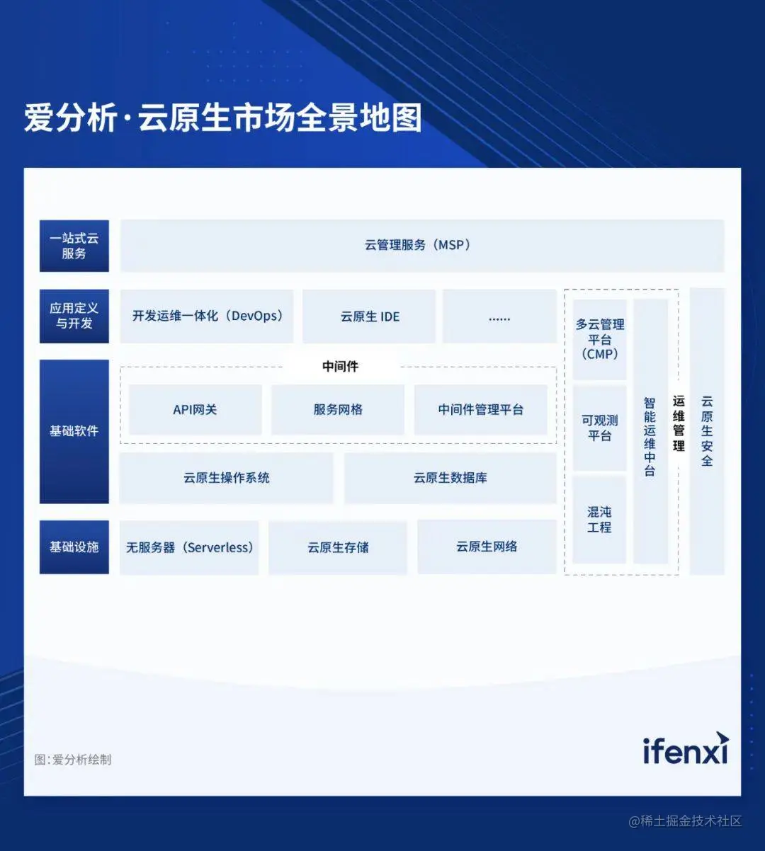 为此,爱分析将发布《2023爱分析·云原生厂商全景报告》,为甲方选型提供参考。如云原生市场全景地图所示,爱分析将市场划分为基础设施、基础软件、应用定义与开发、一站式云服务、运维管理、安全六类,囊括云原生存储、云原生数据库、云原生中间件、开发运维一体化(DevOps)、云原生IDE、云管理服务(MSP)、云原生智能运维中台、云原生安全等细分市场。