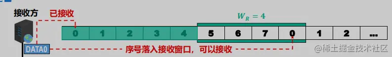 ACK0往后滑动一步,此时覆盖的就是1~5,发送数据分组DATA 5 - 接收窗口首先收到