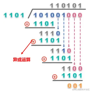 听起来可能不太能理解,我们举一个例子:待发送的信息为101001,生成多项式为G(x) = x^3 + x^2 + 1 ,计算余数
