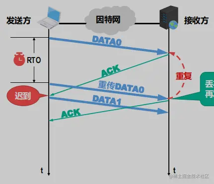问题三:如图,如果接收方返回的ACK时间比较长,同时也触发了超时重传,也就是发送了重复的数据分组,此时ACK的消息接收了,就会发送下一个数据分组,但是重传的数据分组的ACK就会导致下一个数据分组接收: