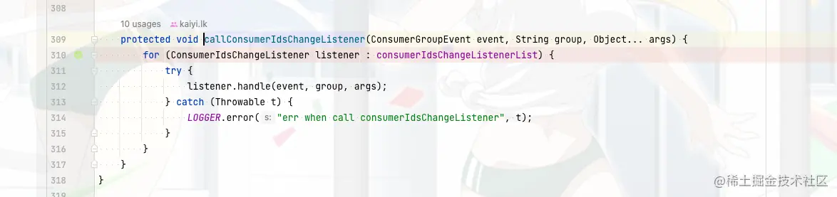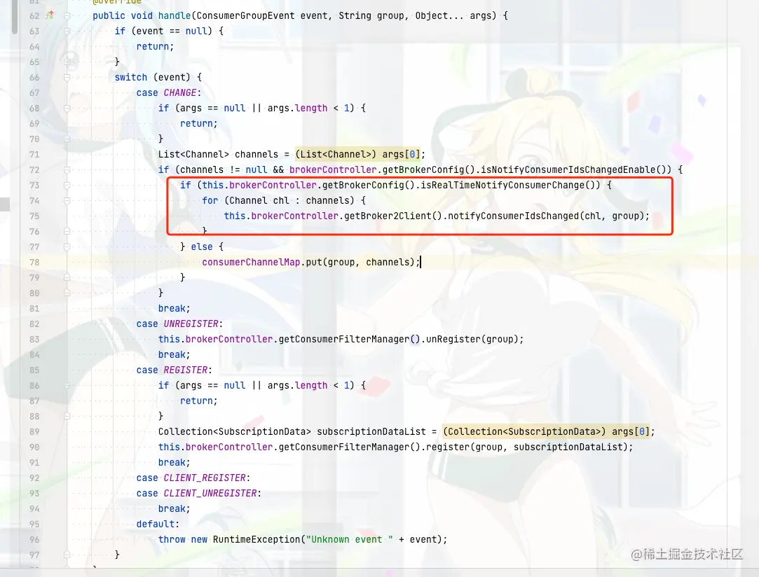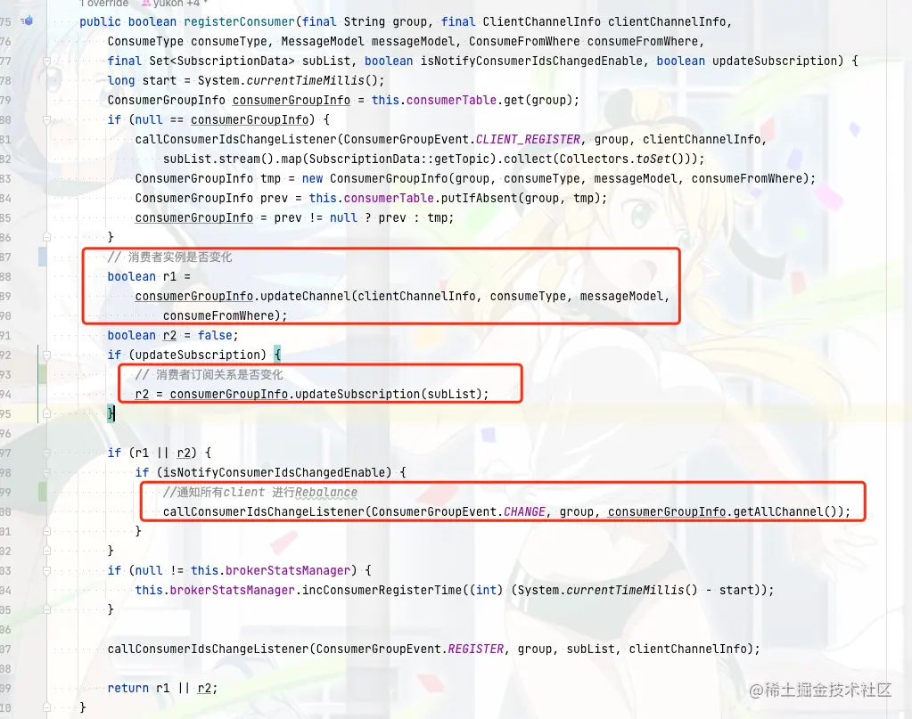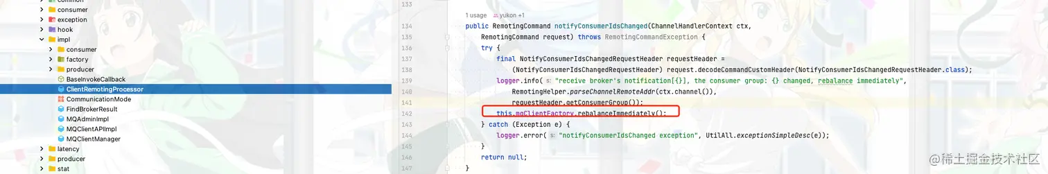 callConsumerIdsChangeListener(ConsumerGroupEvent.CHANGE, group, consumerGroupInfo.getAllChannel());这个方法就是通知client进行Rebalance,具体的实现是参考了类似事件订阅的方式去实现的,这里是发送了一个CHANGE事件