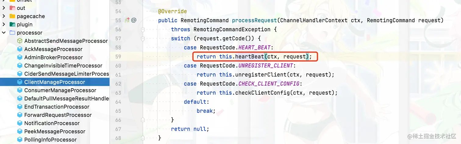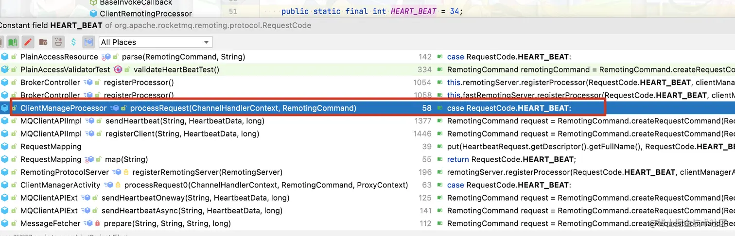 我们看看RequestCode.HEART_BEAT的调用找到`broker的处理逻辑