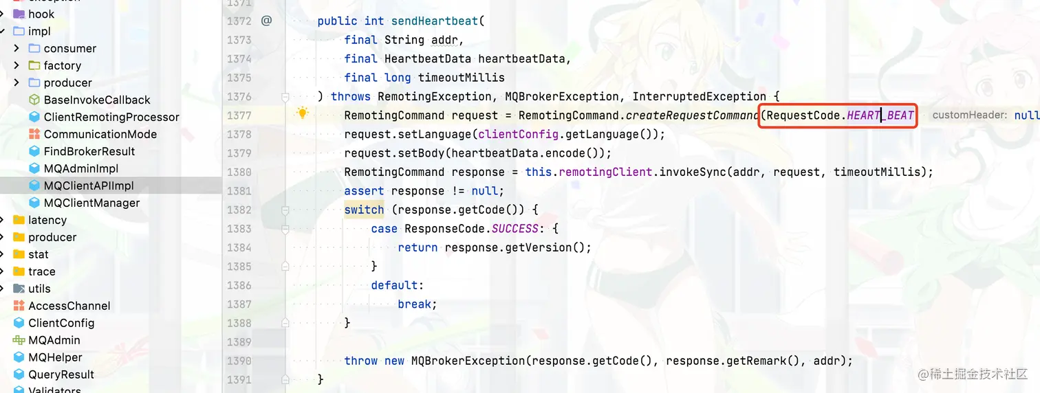我们进入到该方法会发现和我们之前分析的一样,就是发送一个请求到broker,请求码是RequestCode.HEART_BEAT