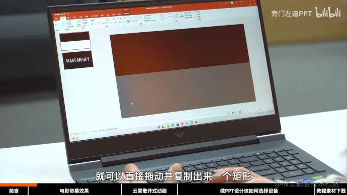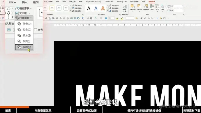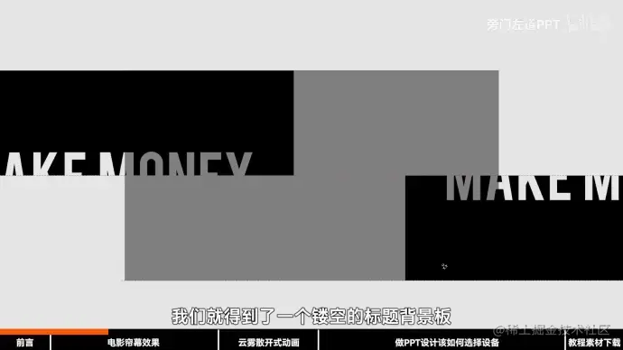 2.在页面中间插入两个相同标题,先选择上方矩形,再选中标题,剪除形状。同理对下方也进行如此操作。