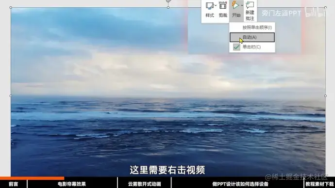 3.插入视频背景。右键,选择开始方式为自动,并将视频置于最底层。