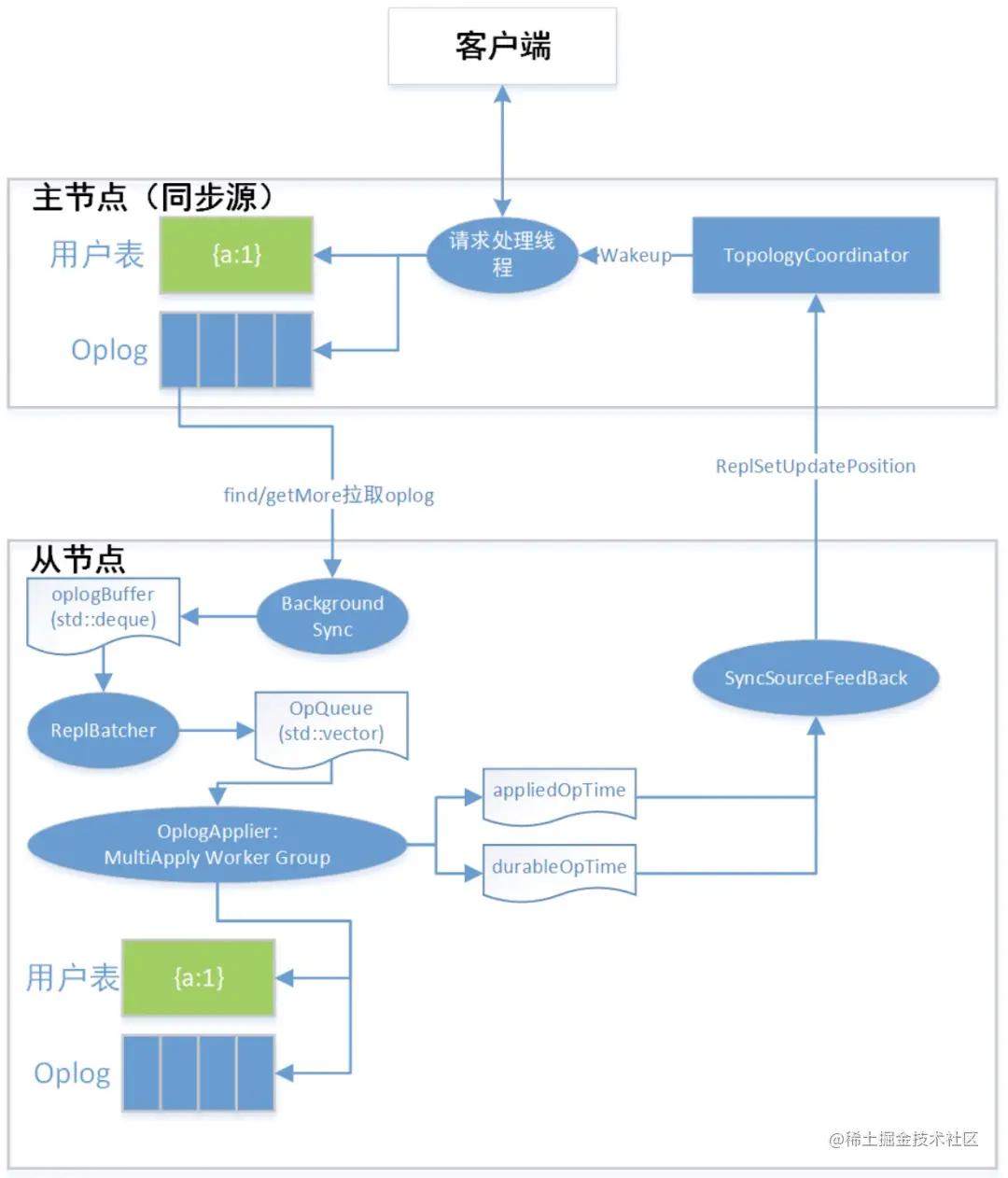 - 主节点**「接受」到各个从节点最新的 「lastAppliedOpTime 和 lastDurableOpTime」,计算大多数节点当前的数据同步进展,并「更新 lastCommittedOpTime」**, 然后唤醒正在等待的请求处理线程主节点上的用户处理线程给用户返回处理结果