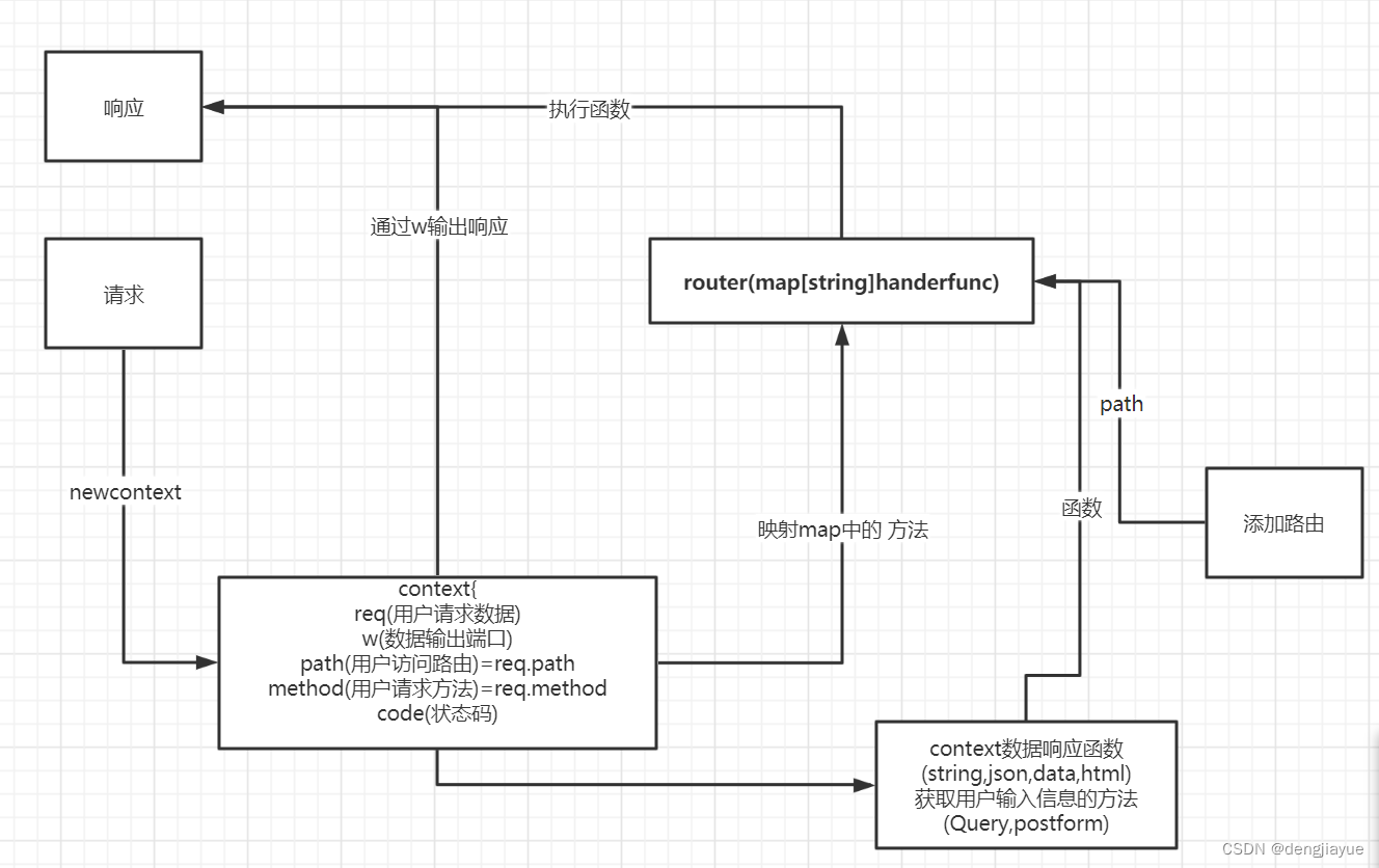 核心:定义 map[string]Handlerfunc用于储存路径与响应函数