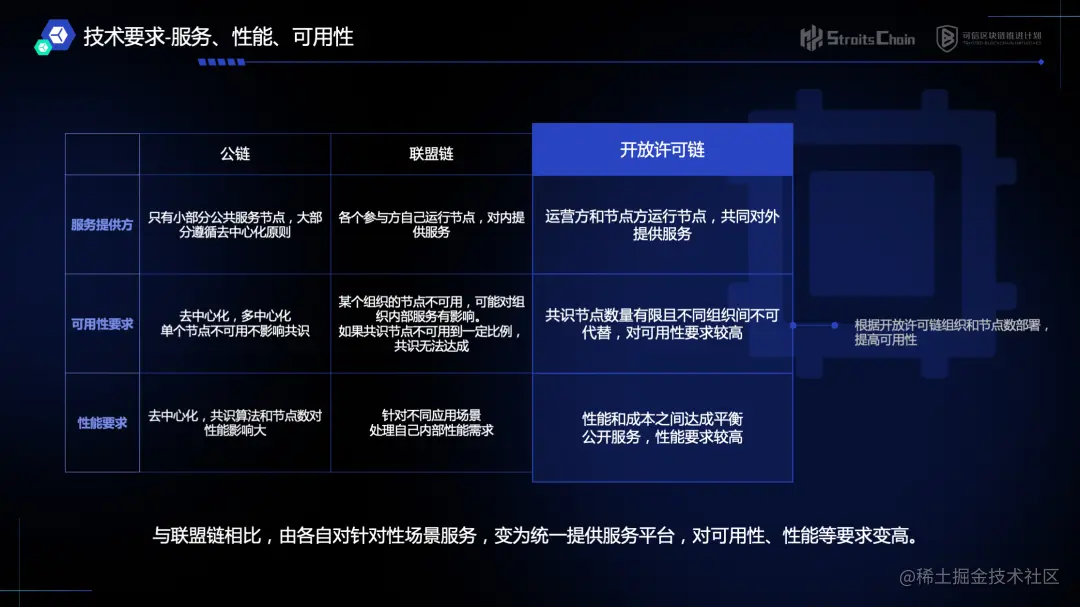 **开放许可链与联盟链相比,由各自对针对性场景服务,变为统一提供服务平台,对可用性、性能等要求更高。**其中,服务提供方由运营方和节点方运行节点,共同对外提供服务;可用性要求方面,共识节点数量有限且不同组织间不可代替,对可用性要求较高,可根据开放许可链组织和节点数部署,提高可用性;在性能要求方面,开放许可链公开对外服务,对性能要求较高,架构设计时需在性能与成本之间达成平衡。