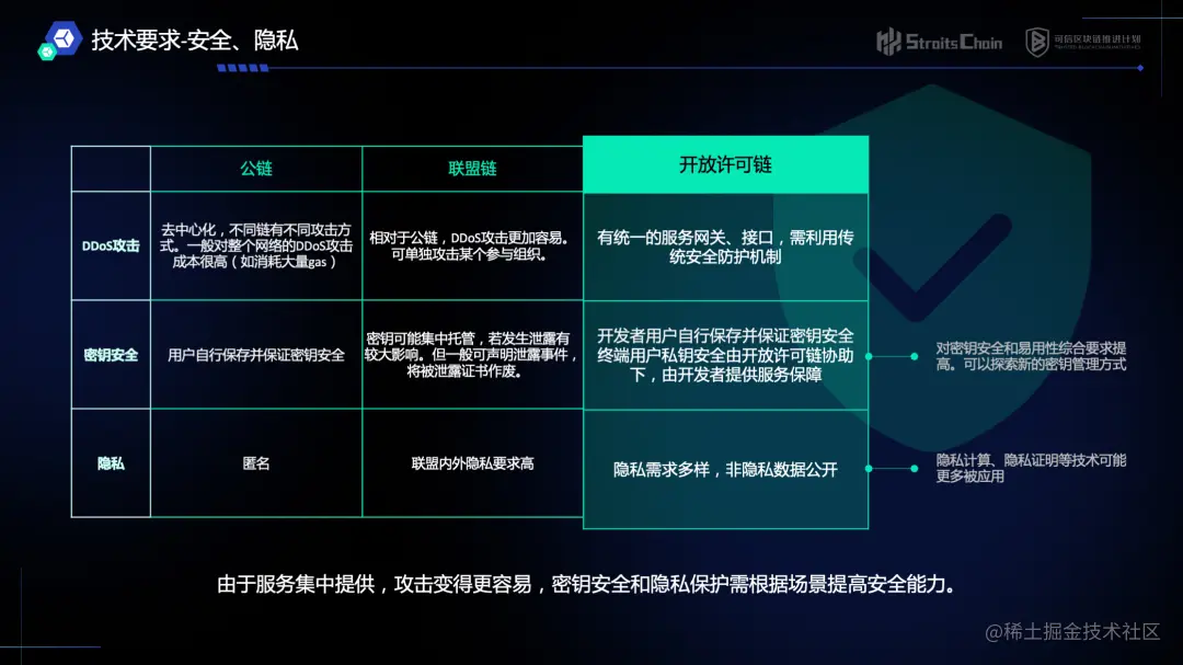 **开放许可链由于服务集中提供,攻击变得更加容易,密钥安全和隐私保护需根据场景提高安全能力。**在应对DDoS攻击方面,开发许可链有统一的服务网关、接口,需利用传统安全防护机制进行安全防护;在密钥安全保障方面,开发者自行保存并保证密钥安全,终端用户私钥安全在开放许可链协助下,由开发者提供服务保障。随着Web3的普及,对区块链的密钥安全和易用性综合要求也随之提高,开放许可链可以探索新的密钥管理方式,例如:采用门限签名 TSS (Threshold Signature Scheme) 来帮助解决私钥和助记词管理的问题。在隐私保护方面,开放许可链的隐私需求多样,非隐私数据公开,而隐私数据默认不公开,可结合隐私计算、隐私证明等技术,更好地保护用户隐私。