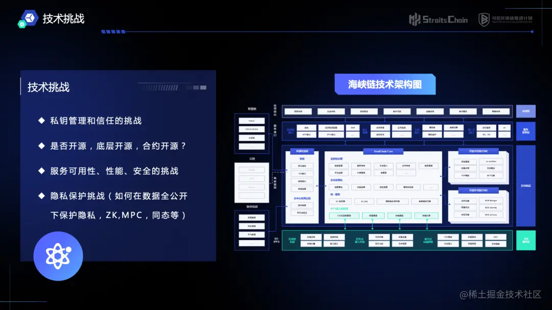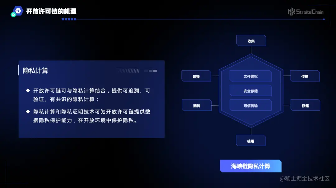 最后,隐私计算和隐私证明技术可为开放许可链提供数据隐私保护能力,在开放环境中保护隐私。“海峡链”正在积极探索与隐私计算技术的结合,为用户提供可追溯、可验证、有共识的隐私保护。