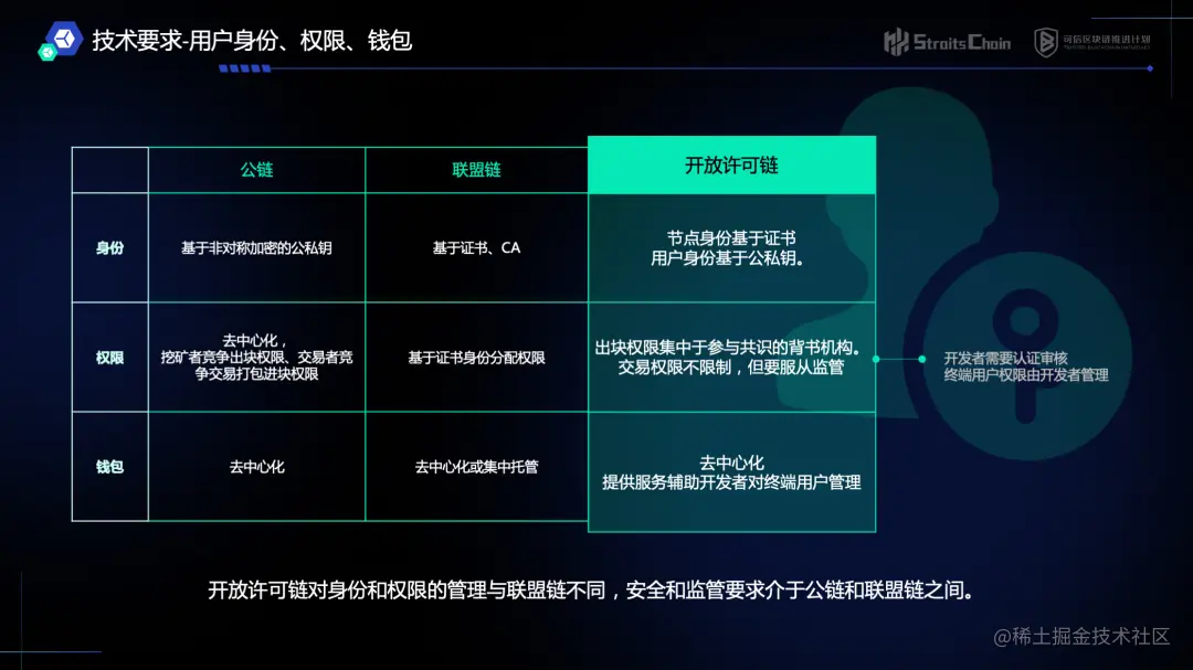 **开放许可链对身份和权限的管理与联盟链不同,安全和监管要求介于公链与联盟链之间。**开放许可链的节点身份基于证书,用户身份基于公私钥;出块权限集中于参与共识的背书机构;交易权限不受限制,但交易内容需要符合监管要求;开发者需要通过认证审核,终端用户权限由开发者统一管理;钱包采用去中心化管理,并需要提供服务辅助开发者对终端用户进行管理的功能。