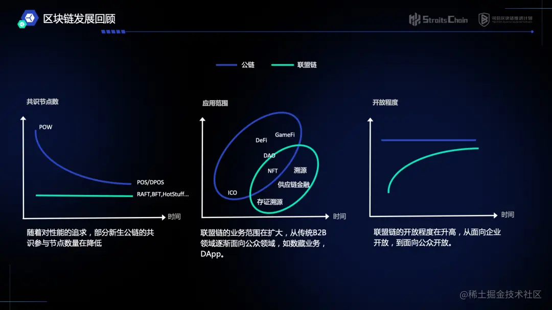公链由高度去中心化开始向弱中心化方向收敛。而联盟链的开放程度在逐渐提升,从最初仅面向政府大型企业开放,再到面向普通企业开放,最后面向公众开放。联盟链的业务范围也随着开放程度的提升而逐步扩大,从传统的B2B领域逐渐面向公众领域,如:数藏业务和元宇宙应用。