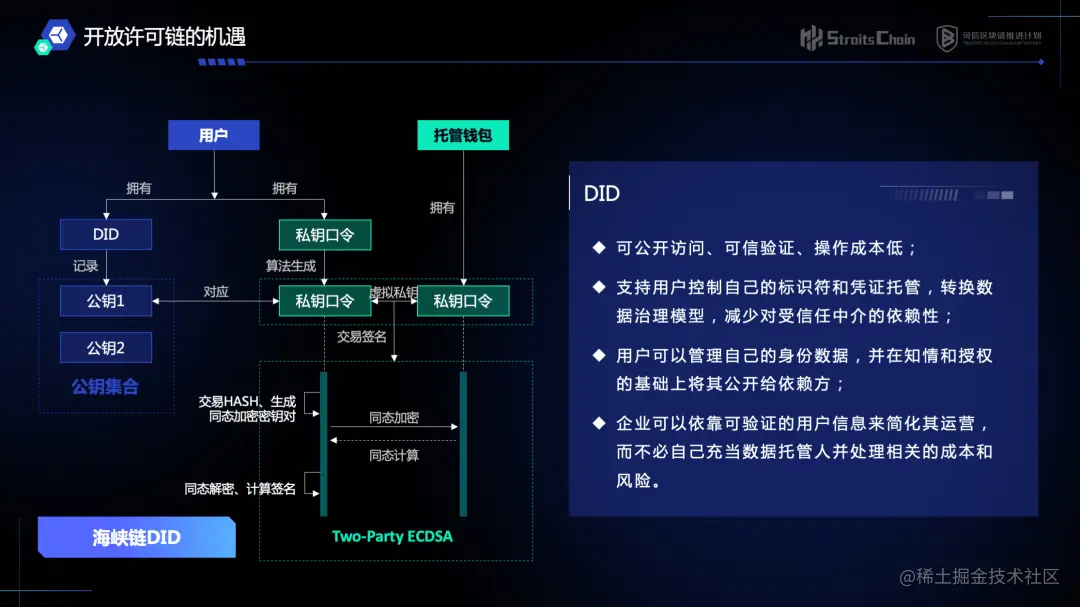 在解决开放许可链的架构设计的技术挑战过程中,“海峡链”技术团队实现了一些新的技术解决方案。“海峡链”基于DIDs标准,采用Lindell [1] 协议,设计了海峡链去中心化账户体系SCID,旨在让海峡链用户在 Web3 和元宇宙世界中能够拥有如同在Web2网络中一样流畅的体验,并享有数据所有权和隐私安全保护,支持可验证、去中心化的数字身份。