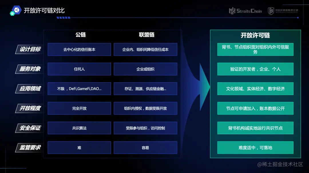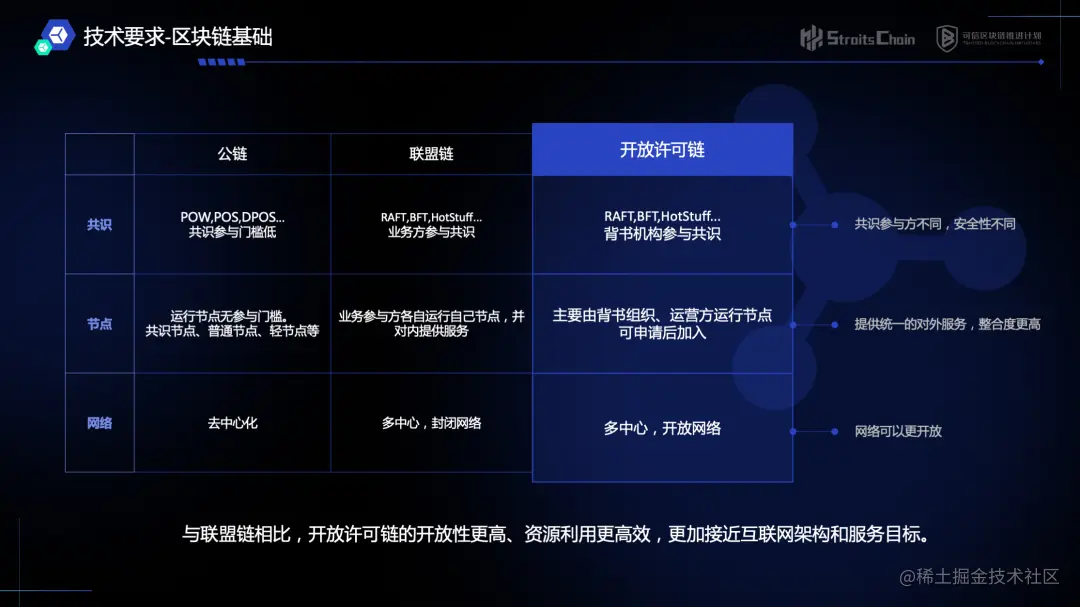 开放许可链综合了联盟链和公有链的优势。《开放许可链能力要求与评估指南》标准的发布很好地引导中国区块链技术的发展,填补了联盟链和公有链在中国企业区块链应用市场的不足。