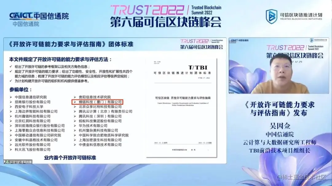2022年12月29日,中国信息通信研究院、中国通信标准化协会和中国互联网协会指导,可信区块链推进计划、中国互联网协会区块链技术应用工作委员会、中国通信标准化协会可信区块链标准推进委员会和大数据技术标准推进委员会联合主办的**“第六届可信区块链峰会”**以线上形式隆重召开。