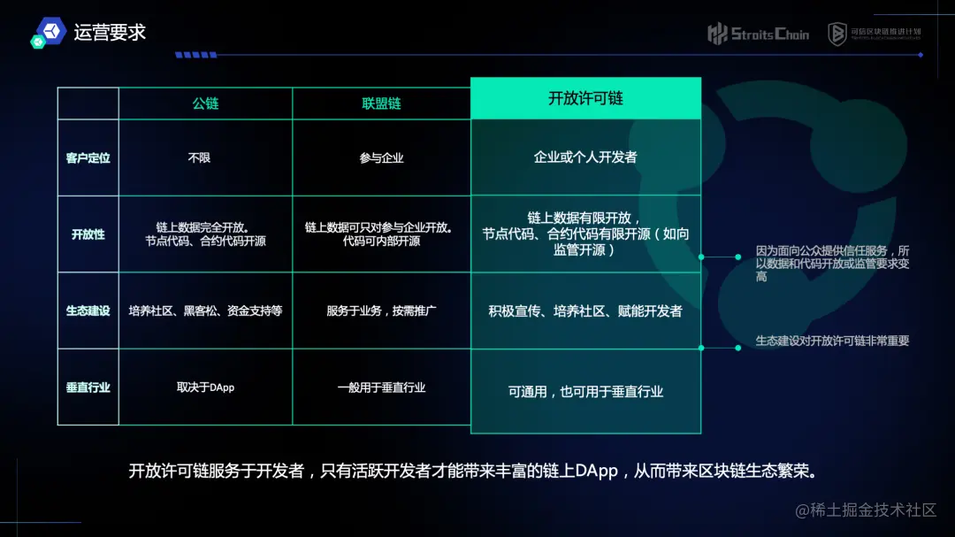 **在运营要求方面,开放许可链服务于开发者,只有活跃开发者才能带来丰富的链上DApp,从而带来区块链生态繁荣。**公链的用户不限,链上数据完全开放,节点代码、合约代码开源,通常由公链的基金会提供资金支持,定期举办黑客松大赛,由项目方组织和培养各自的社区,应用场景取决于DApp,不限制于垂直行业;联盟链用户只限于参与业务的企业或组织,链上数据也只对参与的企业或组织开放,链上服务取决于垂直行业的需求特性,不对外开放,按照内部数据共享需求可适时加入新的企业或组织。开放许可链同时面向公众、个人开发者、企业及组织开放,因面向公众提供信任服务,所以数据和代码开放或监管要求变高,链上数据有限开放,节点代码、合约代码有限开源(如向监管机构开源),生态建设对开放许可链而言非常重要,需要积极宣传生态产品,赋能开发者,培养社区用户,才能带来丰富的链上DApp,从而带来区块链生态繁荣。