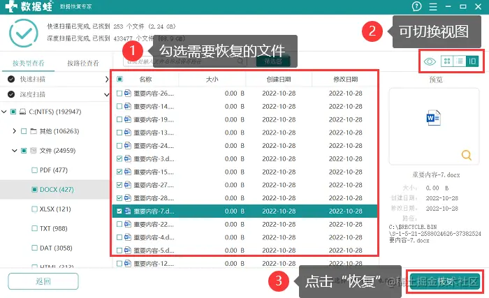 3.软件第二次扫描为深度扫描,等待扫描结束,可在右侧选择合适的查看视图,并勾选需要恢复的文件,完毕后点击【恢复】,为恢复后的文件选择恰当的保存位置,等待恢复完成。