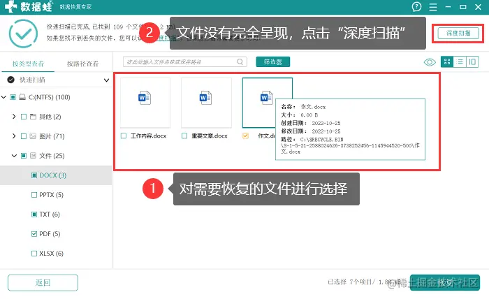 2.该次扫描为软件的快速扫描,等待扫描结束,可以对需要恢复的文件类型和文件进行选择,如果文件没有完全呈现,点击右上角 【深度扫描】 ;