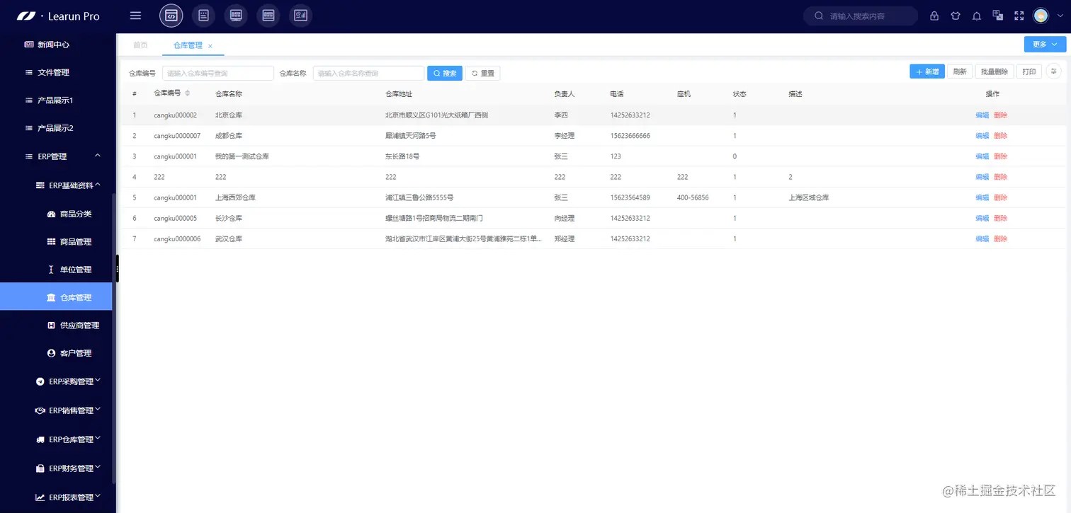 在LeaRun低代码开发平台的仓库管理模块,可以建立企业所有仓库的基础信息库。基础信息库能对仓库名称、使用状态、区域名称、仓库负责人、地址等信息进行集约化管理。