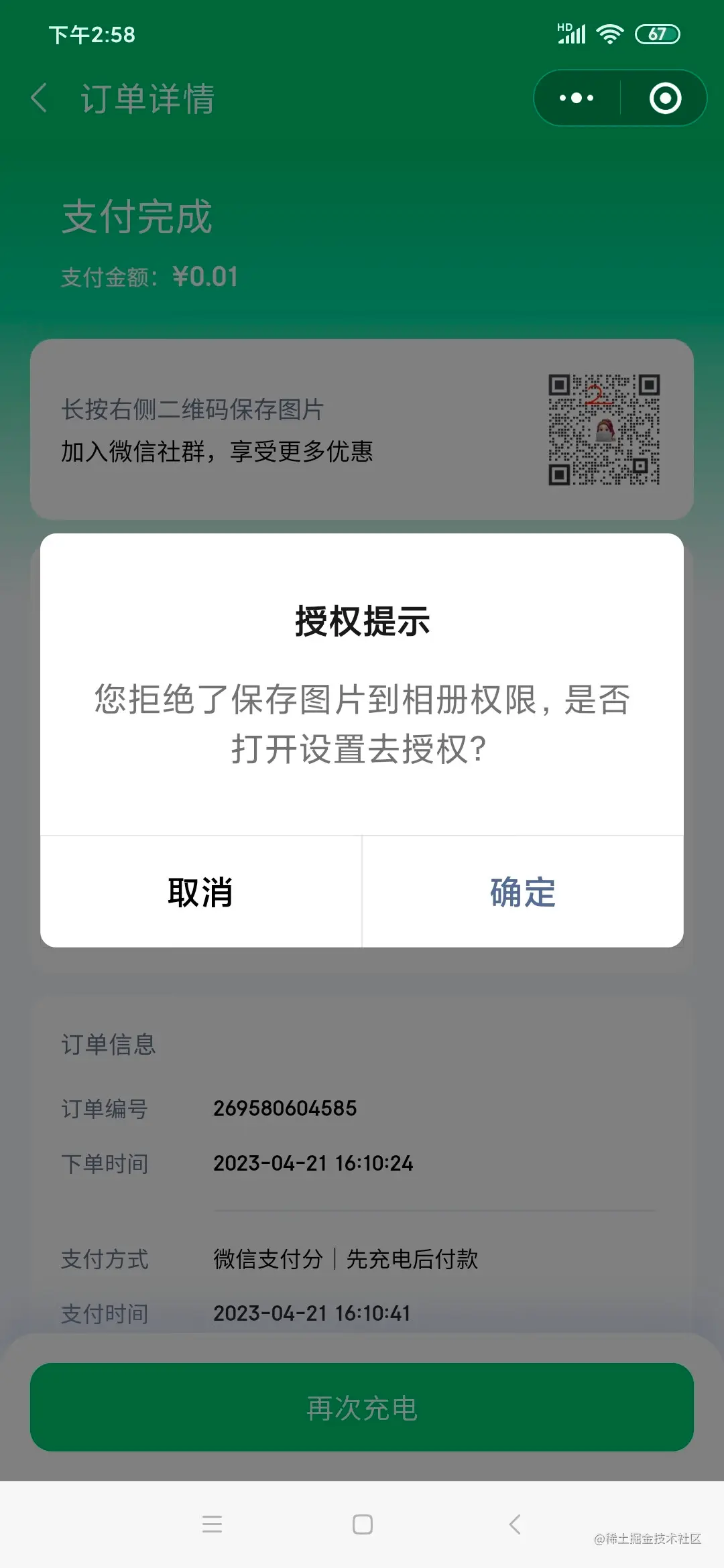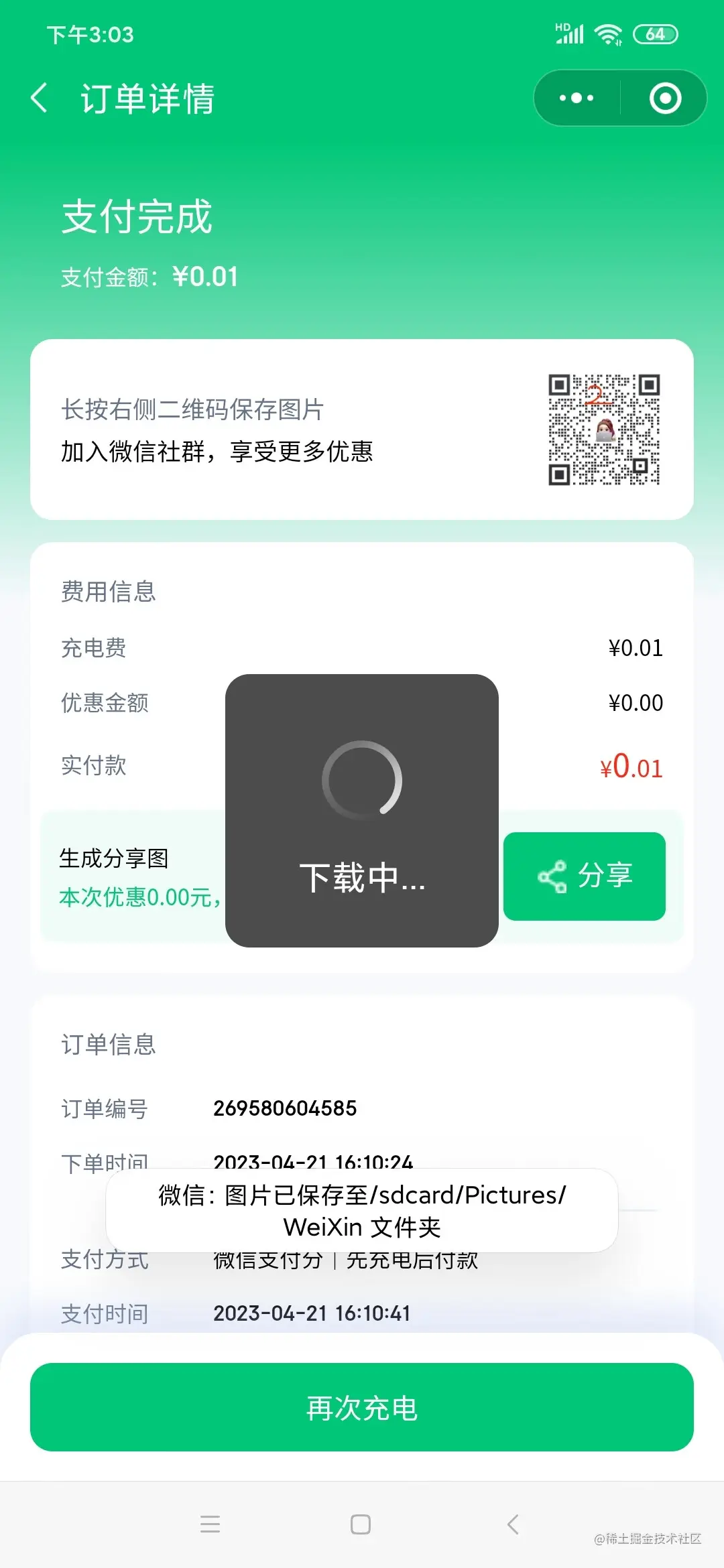 二轮充电业务中,用户充电完成后在订单详情页展示订单相关信息,用户点击分享按钮唤起微信小程序分享菜单,将生成的图片海报分享给微信好友或者下载到本地,好友可通过扫描海报中的二维码加群领取优惠。