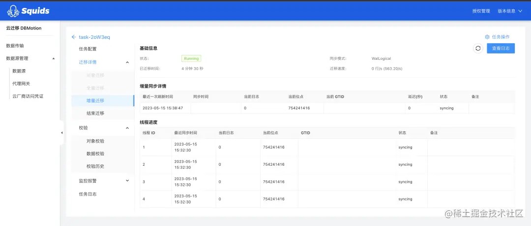- 进入任务详情,查看增量同步的状态,可以看到当前增量同步的速率和状态是否正常。