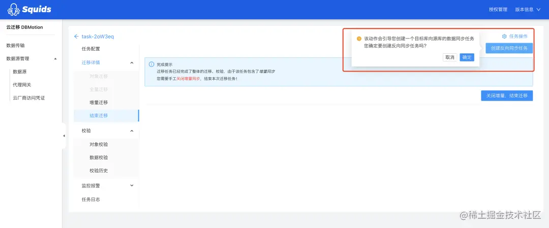 - 如果用户是双向复制,在确认正向同步正常以后,就可以在结束迁移这里"创建反向同步任务"。
