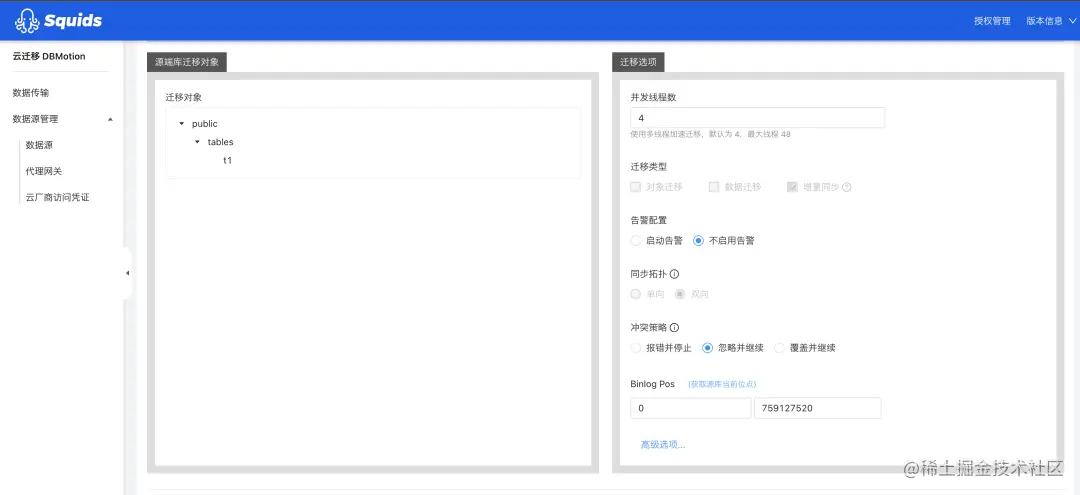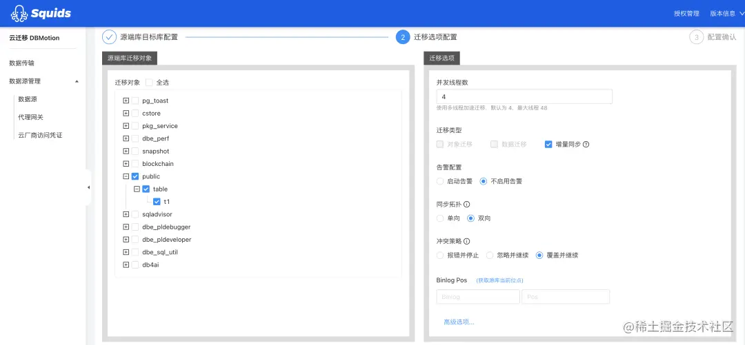 - 进入迁移选项配置页面,迁移对象维持不变,用户可以配置并发线程、是否启用告警和反向同步的冲突策略。反向任务的同步位点可以手工输入,也可以点击获取当前最新位点。