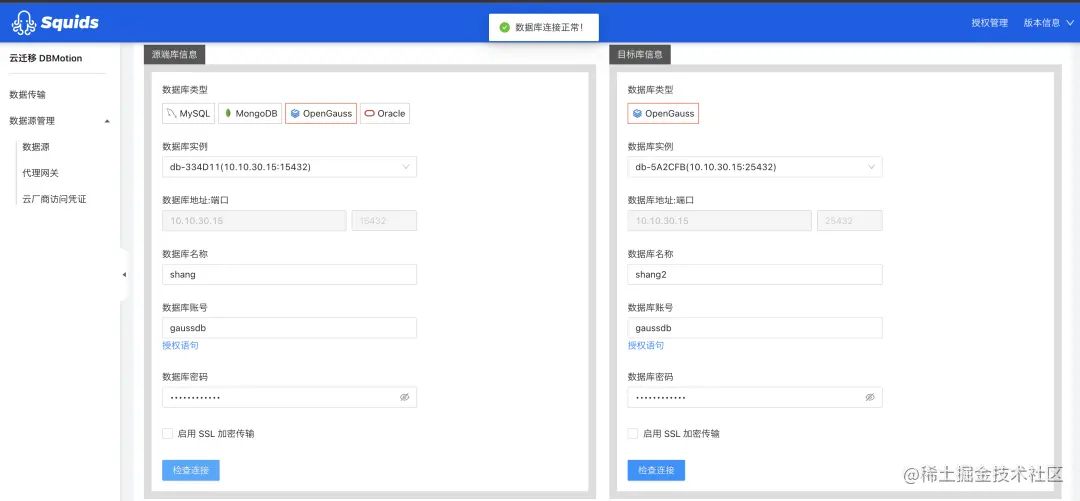 - 新建任务时,用户可以选择openGauss数据库,输入IP、端口、用户名和密码、数据库名后就能够测试数据库连接。