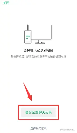 5、在手机上选择**【备份全部聊天记录】**,不关闭并保持微信运行。