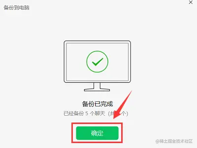 6、这时电脑就会显示备份到电脑,备份完成点击**【确定】**。之后就可以在电脑微信上,找到视频就可以查看了。