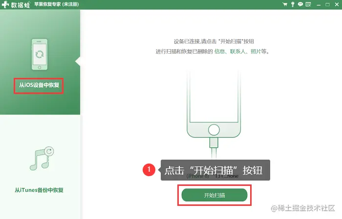 2、在软件**【从iOS设备中恢复】的界面中,点击【扫描】**按钮开始扫描。