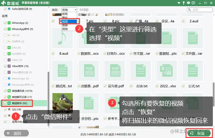 3、扫描完成后,软件将列出所有扫描出来的文件。选择**【微信附件】,并选择【视频】**进行类型的筛选。