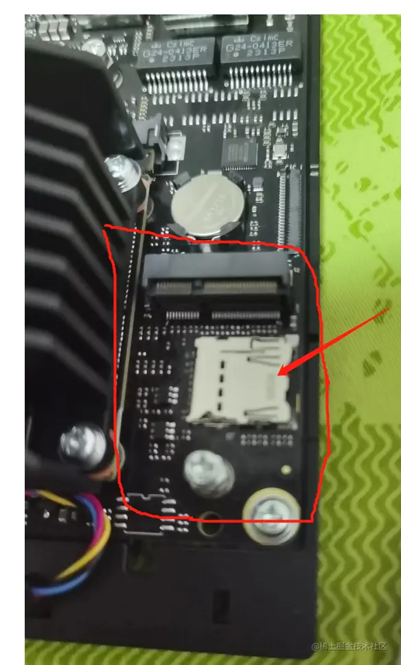 在电池旁边,还有个短的M2接口(框框标记的位置),官方标为M2 KeyE连接器,不知道能接什么。箭头的位置还有个SD卡槽,可以插MiniSD卡,也就是TF卡,应该是插启动卡的地方。