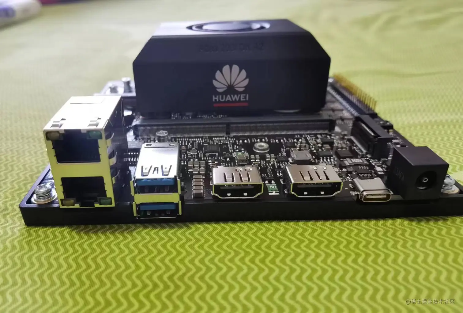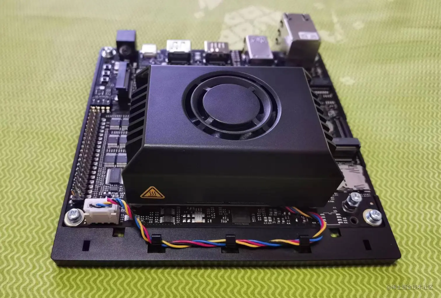 可以看到那个硕大的黑盒子应该是风扇,AI推理芯片需要散热非常强才行,所以从底板牵线给风扇供电。
