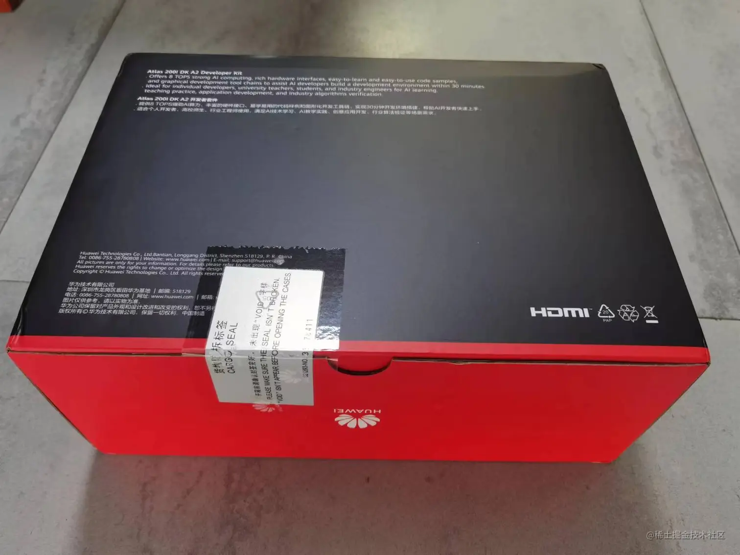 跟200DK和HiLens的盒子类似,拆开包装后,发现包装盒的风格都差不多——五面是黑色,一面是红色: