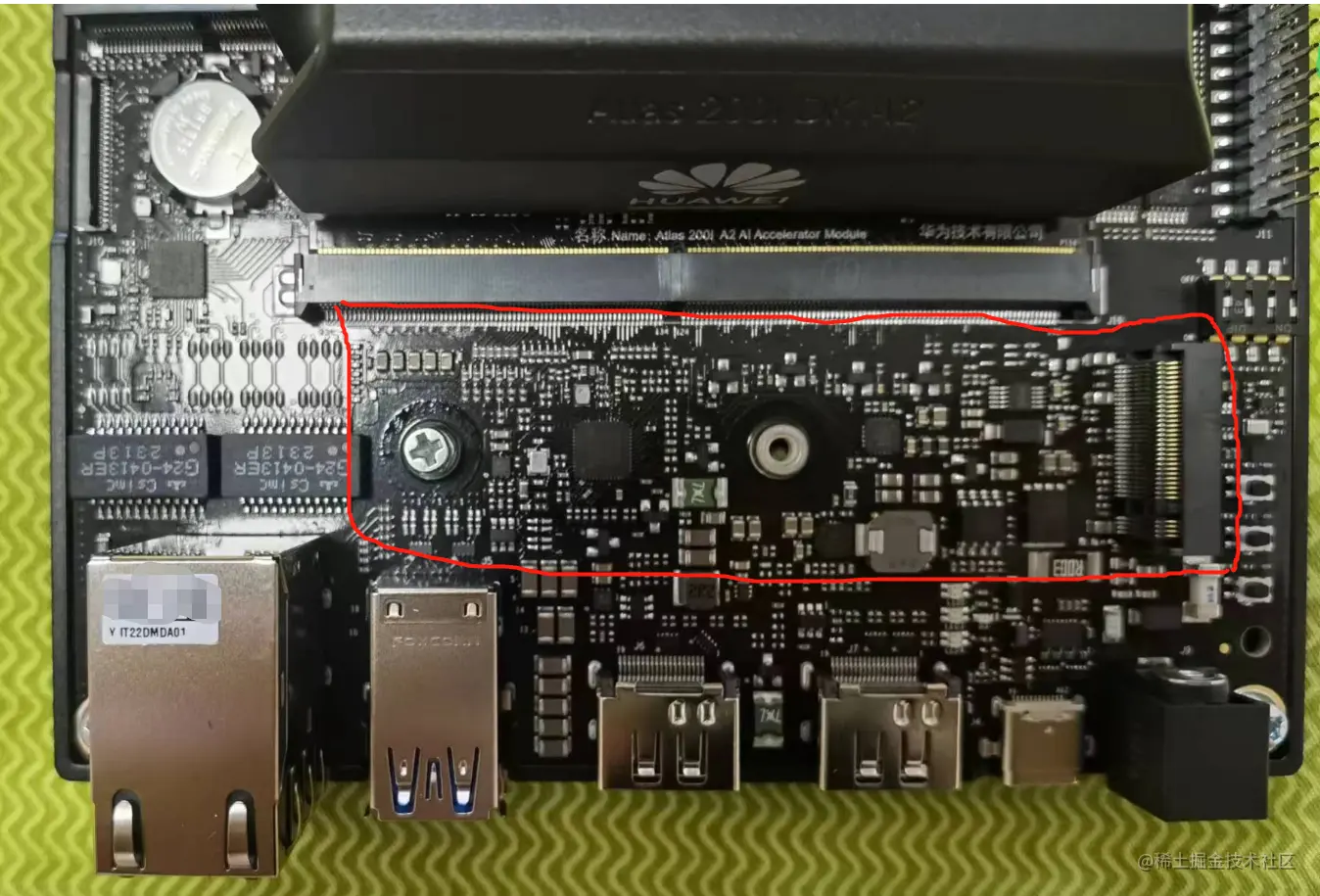 图中张小白标注红线的位置,右边有个M2 SSD的接口,官方标为M2 KeyE连接器,可以插一个M2 SSD的硬盘,但是由于这里没有额外的风扇,所以很可能需要用SSD自带的散热马甲配合散热才行。张小白也在考虑使用SSD来装系统,不知道行不行,反正SSD好像也下单了。
