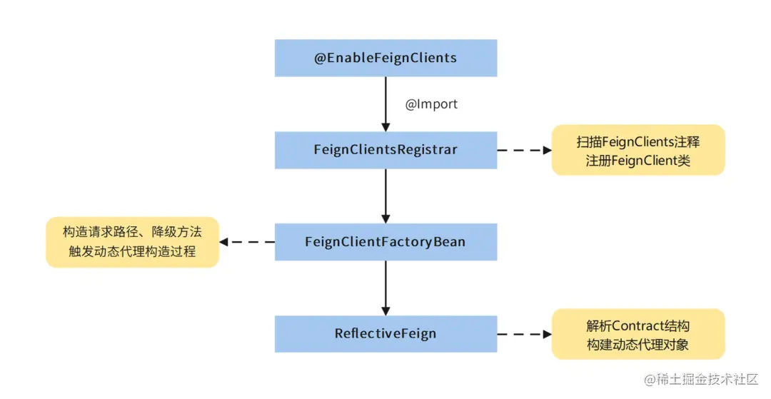 我把 OpenFeign 组件加载过程的重要阶段画在了上图中。接下来我带你梳理一下OpenFeign 动态代理类的创建过程。