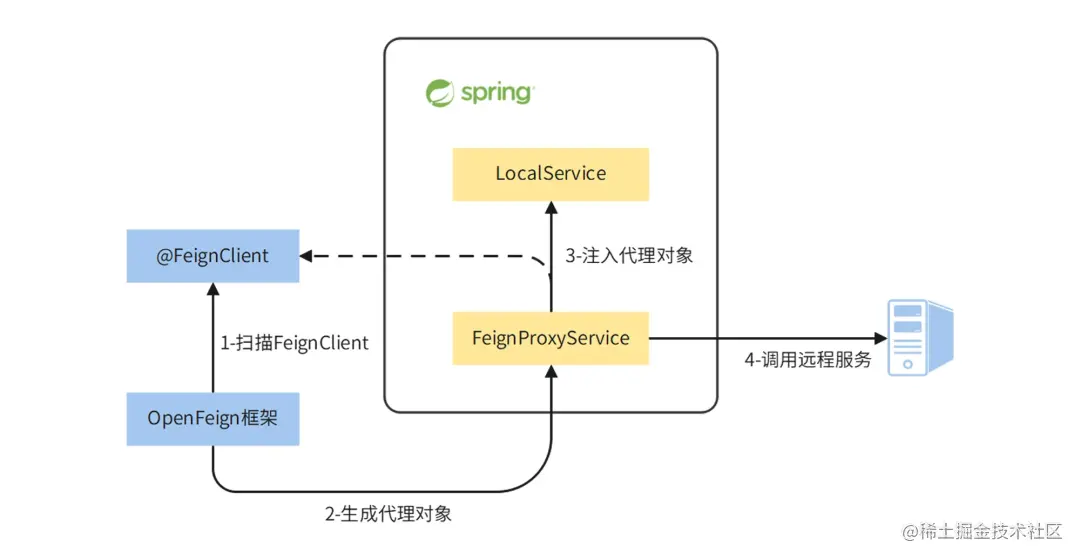 最后,LocalService 会发起底层方法调用。实际上这个方法调用会被 OpenFeign 生成的代理对象接管,由代理对象发起一个远程服务调用,并将调用的结果返回给LocalService。
