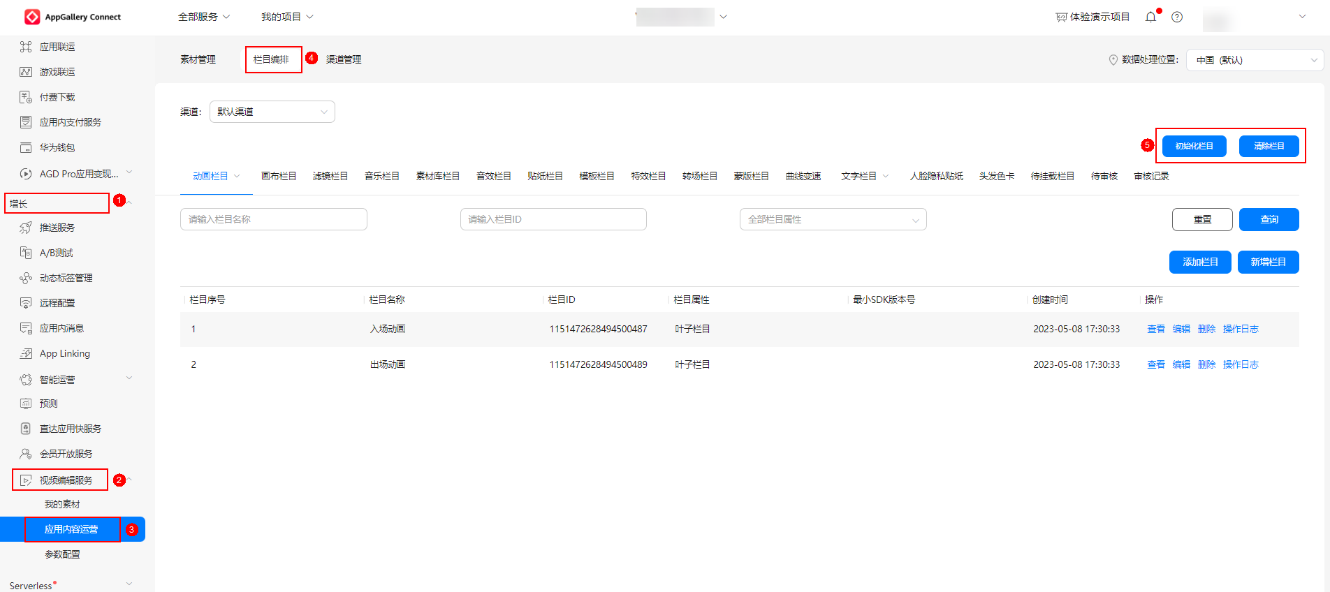 登录AppGallery Connect网站,点击“我的项目”,选择您的项目进入,在左侧导航栏“增长”下选择“视频编辑服务”->“应用内容运营”->“栏目编排”。